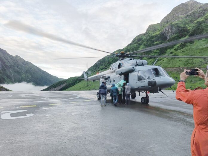 रुद्रप्रयाग। केदारनाथ धाम यात्रा मार्ग पर हुई अतिवृष्टि के चलते प्रभावित यात्रा एव बाबा के दर्शन दोबारा शुरू कराने के लिए युद्धस्तर पर कार्य चल रहे हैं। मुख्यमंत्री पुष्कर सिंह धामी के निर्देशन पर गुरुवार को मौसम साफ होने के बाद हैली सेवाओं से यात्रा एव दर्शन शुरू हो गए हैं। वहीं धाम में हैली रेस्क्यू का इंतजार कर रहे 33 यात्रियों को भी एमआई 17 एव अन्य हैली सेवाओं के माध्यम से दोपहर तक रेस्क्यू कर लिया गया है।