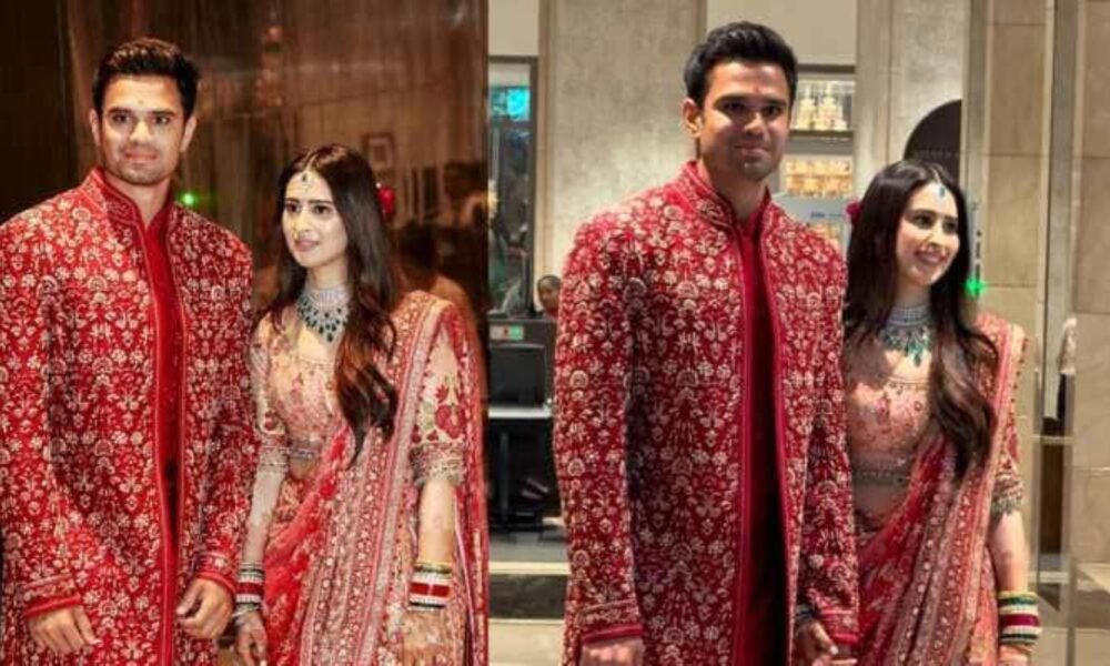 अर्जुन तेंदुलकर ने अपनी दुल्हन के साथ तालमेल बिठाते हुए गहरे लाल रंग की शेरवानी पहनी थी, जिस पर सोने के फूलों के रूपांकनों का बारीक काम था। उन्होंने इसे आइवरी ट्राउजर और पारंपरिक जूतों के साथ पेयर किया था, जो भव्यता और शालीनता का एक परिष्कृत संतुलन पेश कर रहा था।