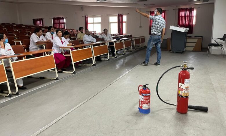 देहरादून। राजकीय दून मेडिकल कॉलेज चिकित्सालय में आग लगने की बढ़ती घटनाओं को लेकर डॉक्टर व नर्सिंग स्टाफ के लिए फायर सेफ्टी ट्रेनिंग की कार्यशाला प्रायोजित की गई, जिसमें फायर सेफ्टी विभाग के कैलाश बिष्ट उपस्थित सभी को अचानक से लगी आग से बचने की जानकारी व फायर एक्सटिंग्विशर को कैसे एक्टिवेट करना है यह जानकारी दी गई।