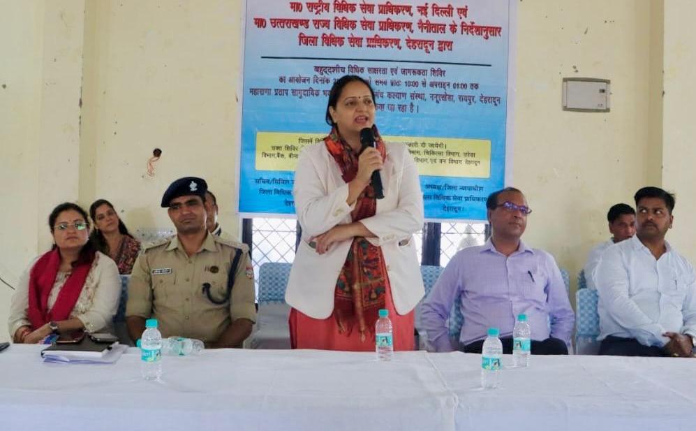 देहरादून। उत्तराखण्ड राज्य विधिक सेवा प्राधिकरण नैनीताल एवं जिला न्यायाधीश अध्यक्ष जिला विधिक सेवा प्राधिकरण, देहरादून प्रेम सिंह खिमाल के निर्देशानुसार जनपद देहरादून के स्थान-महाराणा प्रताप सामुदायिक भवन छत्रिया चेतना मंच, कल्याण संस्था ननूरखेड़ा, रायपुर, देहरादून, उत्तराखण्ड में बहुउद्देशीय विधिक साक्षरता एवं जागरूकता शिविर का आयोजन किया गया। उक्त शिविर का शुभारम्भ सचिव सिविल जज (वरिष्ठ प्रभाग), जिला विधिक सेवा प्राधिकरण, देहरादून सीमा डुंगराकोटी द्वारा किया गया। शिविर में विभिन्न सरकारी, गैर सरकारी विभागों के प्रतिनिधि उपस्थित हुए, जिनके द्वारा अपने-अपने विभाग की योजनाओं के बारे में विस्तार से जानकारी दी गयी। शिविर में सचिवध्सिविल जज (वरिष्ठ प्रभाग), जिला विधिक सेवा प्राधिकरण, देहरादून द्वारा जिला विधिक सेवा प्राधिकरण, देहरादून से मिलने वाली निशुल्क विधिक सेवा के बारे में उपस्थित प्रतिभागियों को जागरूक किया। संभागीय परिवहन अधिकारी शैलेश तिवारी देहरादून द्वारा सर्वप्रथम सड़क सुरक्षा कानून के बारे में विस्तृत जानकारी दी गई जिसमें उनके द्वारा बताया गया कि जब भी कोई रोड पर गाड़ी लेकर निकलते हैं तो उनके पास यह मुख्य दस्तावेज, जिसमें प्रमुख लाइसेंस, इंश्योरेंस, रजिस्ट्रेशन पॉल्यूशन सर्टिफिकेट होना आवश्यक है तथा गाड़ी चलाते समय हेलमेट तथा सीट बेल्ट का प्रयोग करना आवश्यक है एवं ट्रैफिक सिग्नल के बारे में भी विस्तारपूर्वक बताया गया। अंत में उनके द्वारा डीजी लॉकर एप के बारे में भी बताया गया एवं इसके फायदे की जानकारी दी गई। एल०आई०सी० के वरिष्ठ प्रबंधक मयंक थपलियाल द्वारा एल०आई०सी० के बारे में एवं इसके फायदे के संबंध में विस्तृत जानकारी दी गई जिसमें पेंशन जैसे सुविधाओं के बारे में बताया गया तथा समय-समय पर एल०आई०सी० द्वारा की जाने वाली जिसमें विभाग द्वारा चैरिटी के रूप में एंबुलेंस बस आदि विभिन्न संस्थाओं एवं सरकारी विभागों को दी जाती है वर्तमान में एल०आई०सी० में लगभग 12.3 लाख एजेंट पूरे देश में कार्यरत है जो समाज के विभिन्न स्तर के लोगों के साथ जुड़े है।